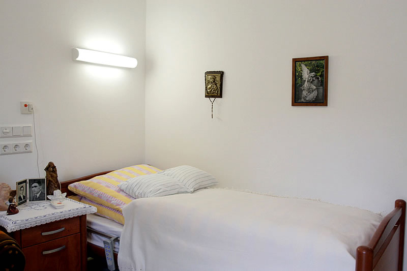 Die Zimmer sind mit einem modernen elektrischen Pflegebett und einem Nachttisch ausgestattet.