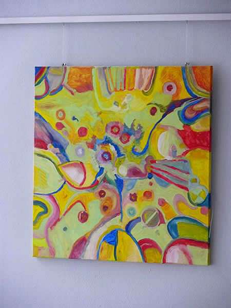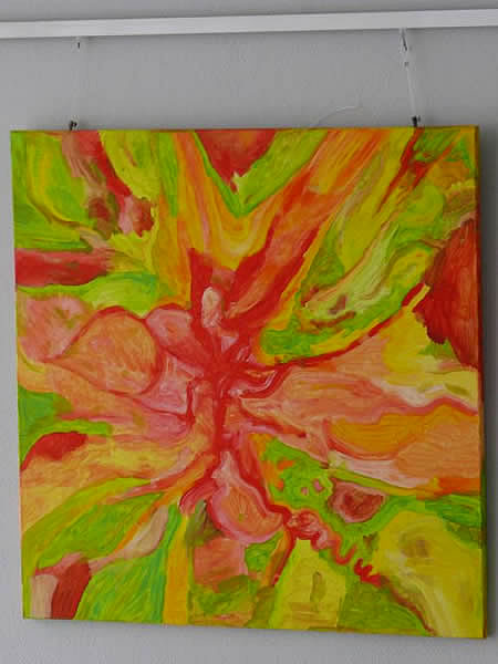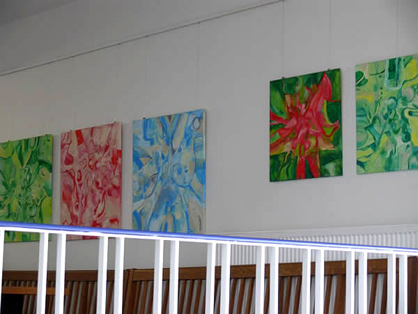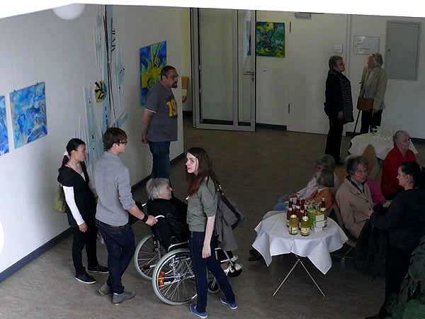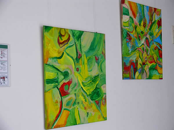Die Bilder, die bis September zu sehen sind, sind nur eine kleine Auswahl aus mittlerweile über 80 Werken. „Gespräche mit Pinsel und Farbe“, dieser Titel der Ausstellung bringt auf den Punkt, was im Zentrum des Projektes steht: Kreativität und Kommunikation.