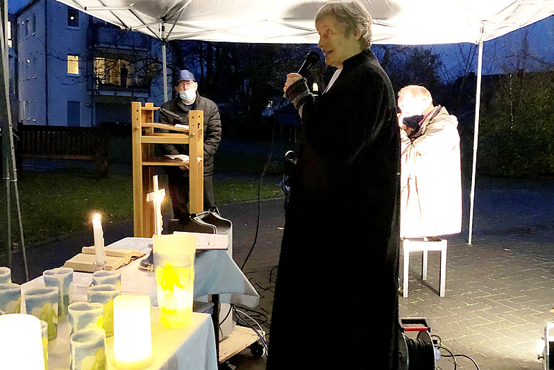 Unter einem Pavillon vor dem Haupteingangsbereich des Hauses standen - mit Abstand und Mund-Nasen-Schutz - die Angehörigen. Unter einem zweiten Pavillon zelebrierten Pfarrerin Lindtraut Belthle-Drury und weitere Liturg*innen den Gottesdienst. Nachbar*innen des angrenzenden Schwemeckerweg in Soest kamen auf ihre Balkone, auch einige Bewohnerinnen schauten aus ihren Fenstern zu. „Es tut mir gut, dass sie den Gottesdienst trotz Corona feiern und eine Kerze für meine Mutter im Gedenken angezündet haben – das spendet Trost!“, äußerte eine Angehörige.