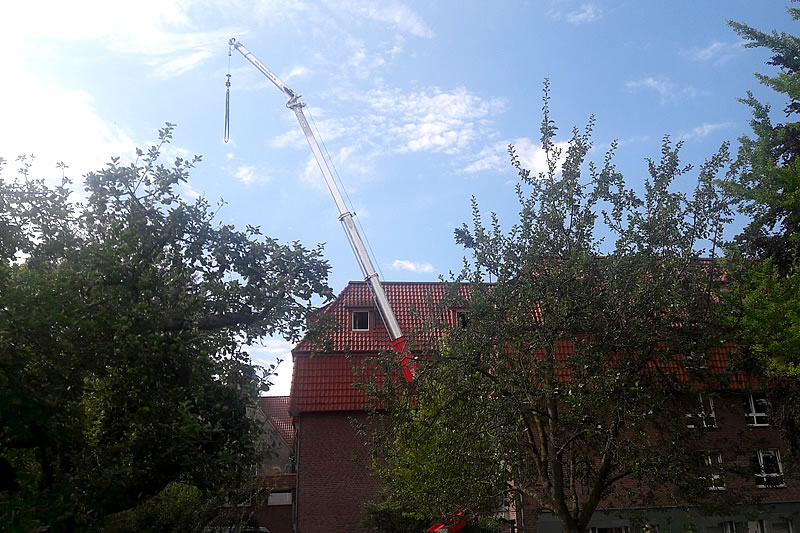 Ein Kran beförderte die Klimatechnik auf das Dach des Alten- und Pflegeheimes, Lina-Oberbäumer-Haus.