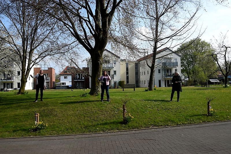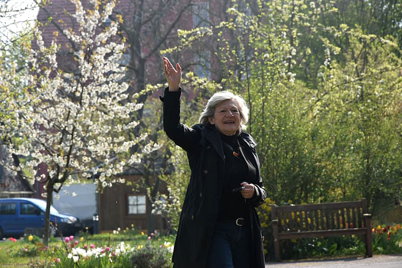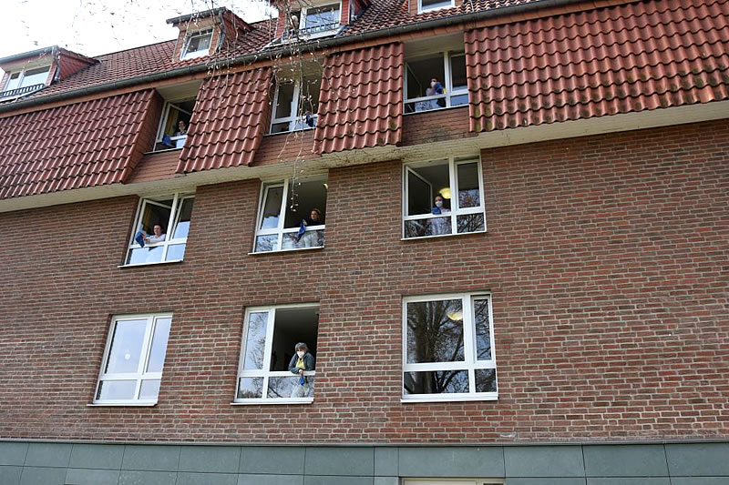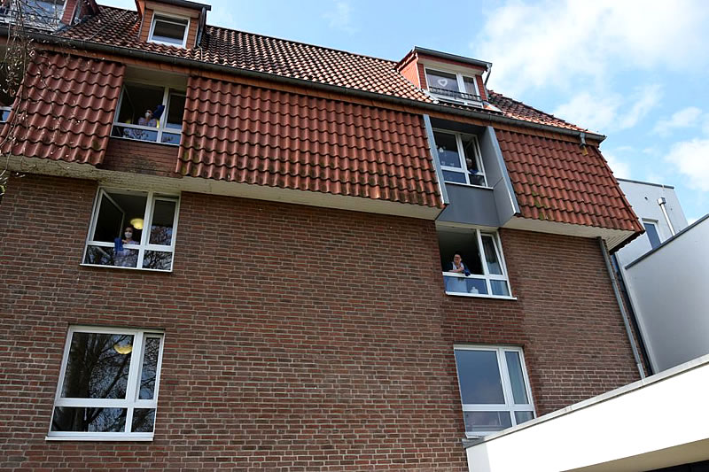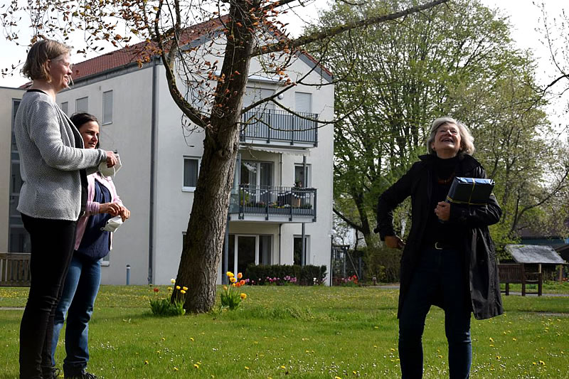 Pünktlich um 10 Uhr hatten sich an den Fenstern des Hauses viele Mitarbeiterinnen und Bewohnerinnen versammelt, um Angelika Weigt-Blätgen alles Gute für die Zukunft und Gottes Segen zu wünschen. Zum Abschluss sangen die Mitarbeiterinnen gemeinsam mit den Bewohnerinnen den Kanon „viel Glück und viel Segen“ und winkten zum Abschied mit Tüchern ein letztes „Auf Wiedersehen“.