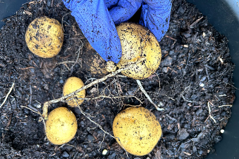 Ob die roten, lilanen, weißlichen oder gelben Kartoffeln den Küchenfeen bereits bekannt waren? Die einen sagen so, die anderen so… King Edward, Cheyenne, Gaiane, Desiree, Sieglinde: so heißen 5 alte und seltene Sorten, die die Bewohner*innen mit Mitarbeitenden im Mai gepflanzt hatten.