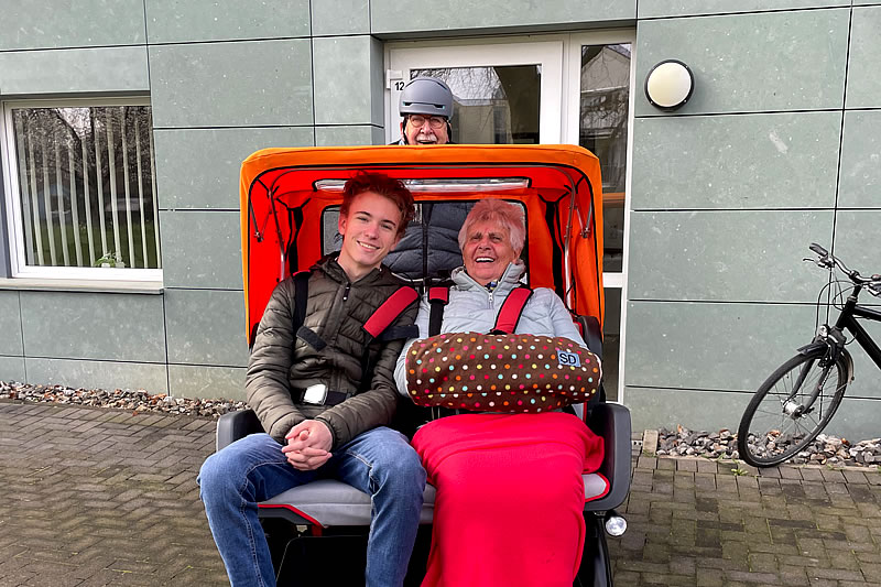 Nun ist die neue Rikscha-Saison wieder mit den Bewohnerinnen des Lina-Oberbäumer-Hauses gestartet. Sie dürfen Wünsche äußern, wohin es gehen soll: Zur alten Schule, zur bekannten Kirche oder zu der Eiche, unter der sie zum ersten Mal küssten...