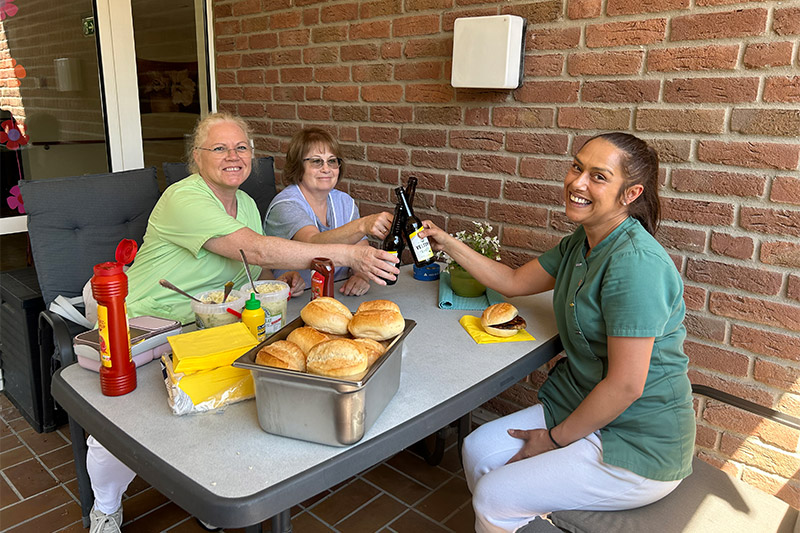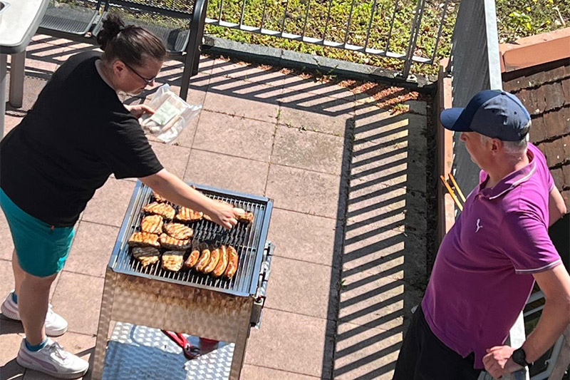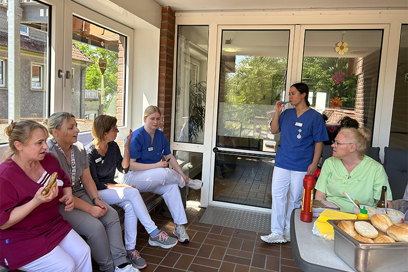Mittags zur Übergabe-Zeit gab es am Tag der Pflege für alle Mitarbeiterinnen des Hauses eine Überraschung: Stefanie Topka, Leiterin des Sozialen Dienstes des Lina-Oberbäumer-Hauses, grillte Hähnchen, Steaks und Würstchen. Dazu gab es Brötchen Krautsalat, Ketchup und Senf. Für jene, die in den Feierabend gingen, gab es einen Radler dazu.