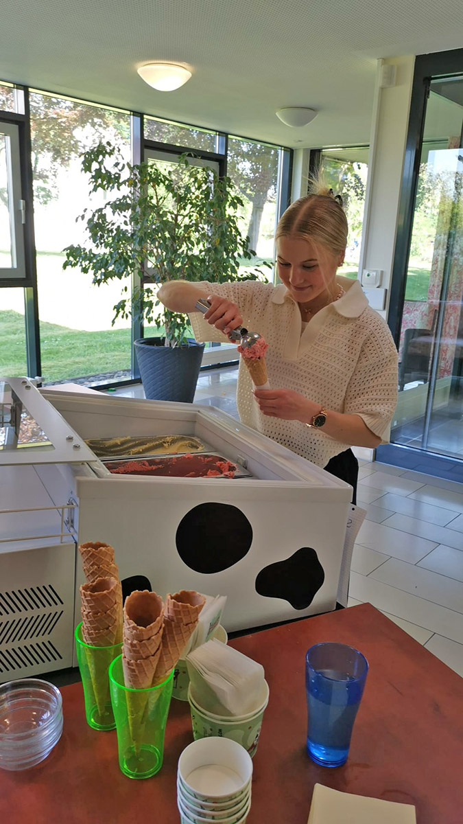 Ob Mutter oder nicht – für alle Bewohnerinnen gab es am Muttertag eine Gaumenfreude. Jede Bewohnerin des Lina-Oberbäumer-Hauses und auch die Angehörigen konnten ein Eis mit zwei Kugeln erhalten - je nach Wunsch Cookie, Vanille oder Erdbeer, im Becher oder im Hörnchen, mit oder ohne einer Eiswaffel obendrauf.